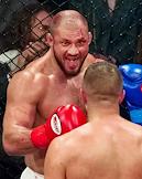 Турнир по смешанным единоборствам и кикбоксингу RCC 15 в спортивном комплексе "Арена Уралец". Российский боец Иван Штырков (Уральский Халк) (слева) и белорусский боец Петр Романкевич (справа) во время боя.
