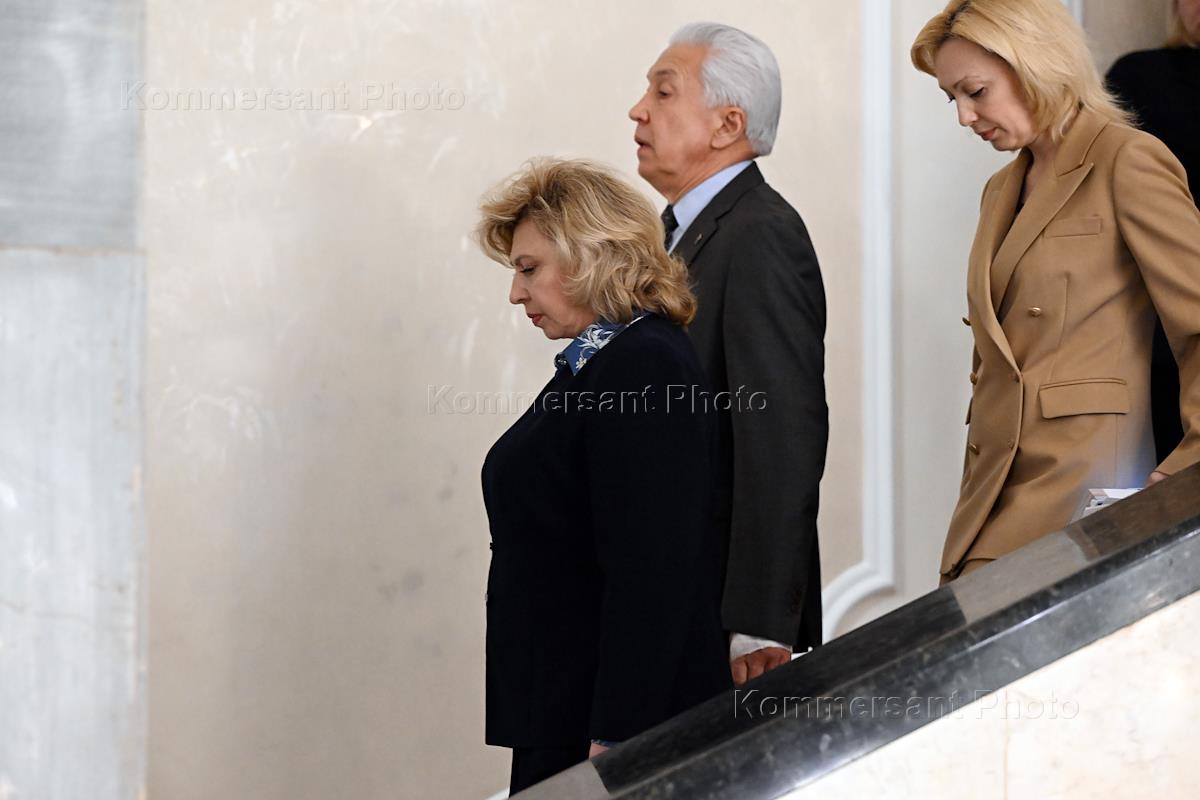 Руководитель фракции "Единая Россия" в Государственной думе (ГД) России Владимир Васильев (справа) и уполномоченный по правам человека в России Татьяна Москалькова (в центре) во время заседания президиума фракции в ГД России.