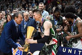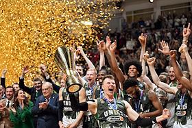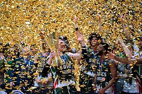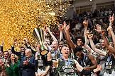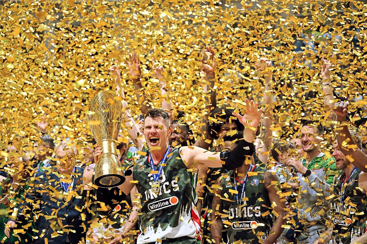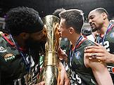 Единая лига ВТБ по баскетболу. Финал. Матч между командами УНИКС (Казань) - "Локомотив-Кубань" (Краснодар) на стадионе "Баскет-холл"(Казань). Игроки команды УНИКС с кубком во время церемонии награждения.