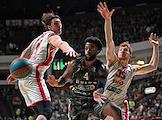 Единая лига ВТБ по баскетболу. Финал. Матч между командами УНИКС (Казань) - "Локомотив-Кубань" (Краснодар) на стадионе "Баскет-холл"(Казань). Игрок команды УНИКС Джален Рейнольдс (слева) и игрок команды "Локомотив-Кубань" Андрей Мартюк (в центре) во время матча.