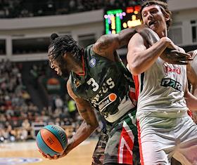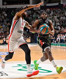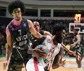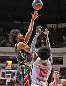 Единая лига ВТБ по баскетболу. Финал. Матч между командами УНИКС (Казань) - "Локомотив-Кубань" (Краснодар) на стадионе "Баскет-холл"(Казань). Игрок команды УНИКС Луи Лабери (слева) во время матча.