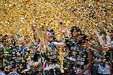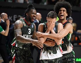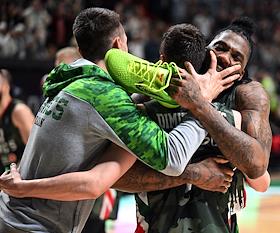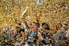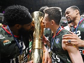 Единая лига ВТБ по баскетболу. Финал. Матч между командами УНИКС (Казань) - "Локомотив-Кубань" (Краснодар) на стадионе "Баскет-холл"(Казань). Игроки команды УНИКС после победы в серии матчей.