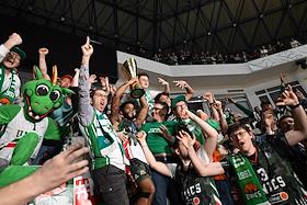 Единая лига ВТБ по баскетболу. Финал. Матч между командами УНИКС (Казань) - "Локомотив-Кубань" (Краснодар) на стадионе "Баскет-холл"(Казань). Болельщики команды УНИКС на трибуне во время матча.