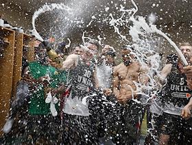 Единая лига ВТБ по баскетболу. Финал. Матч между командами УНИКС (Казань) - "Локомотив-Кубань" (Краснодар) на стадионе "Баскет-холл"(Казань). Игроки команды УНИКС в раздевалке после победы в серии матчей.
