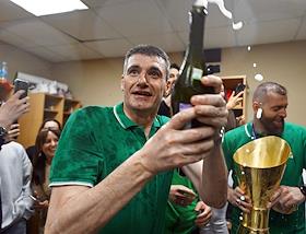 Единая лига ВТБ по баскетболу. Финал. Матч между командами УНИКС (Казань) - "Локомотив-Кубань" (Краснодар) на стадионе "Баскет-холл"(Казань). Главный тренер баскетбольной команды УНИКС Велемир Перасович в раздевалке после победы в серии матчей.
