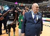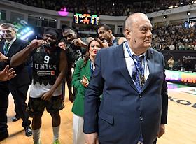 Единая лига ВТБ по баскетболу. Финал. Матч между командами УНИКС (Казань) - "Локомотив-Кубань" (Краснодар) на стадионе "Баскет-холл"(Казань). Президент баскетбольного клуба УНИКС Евгений Богачев во время церемонии награждения.