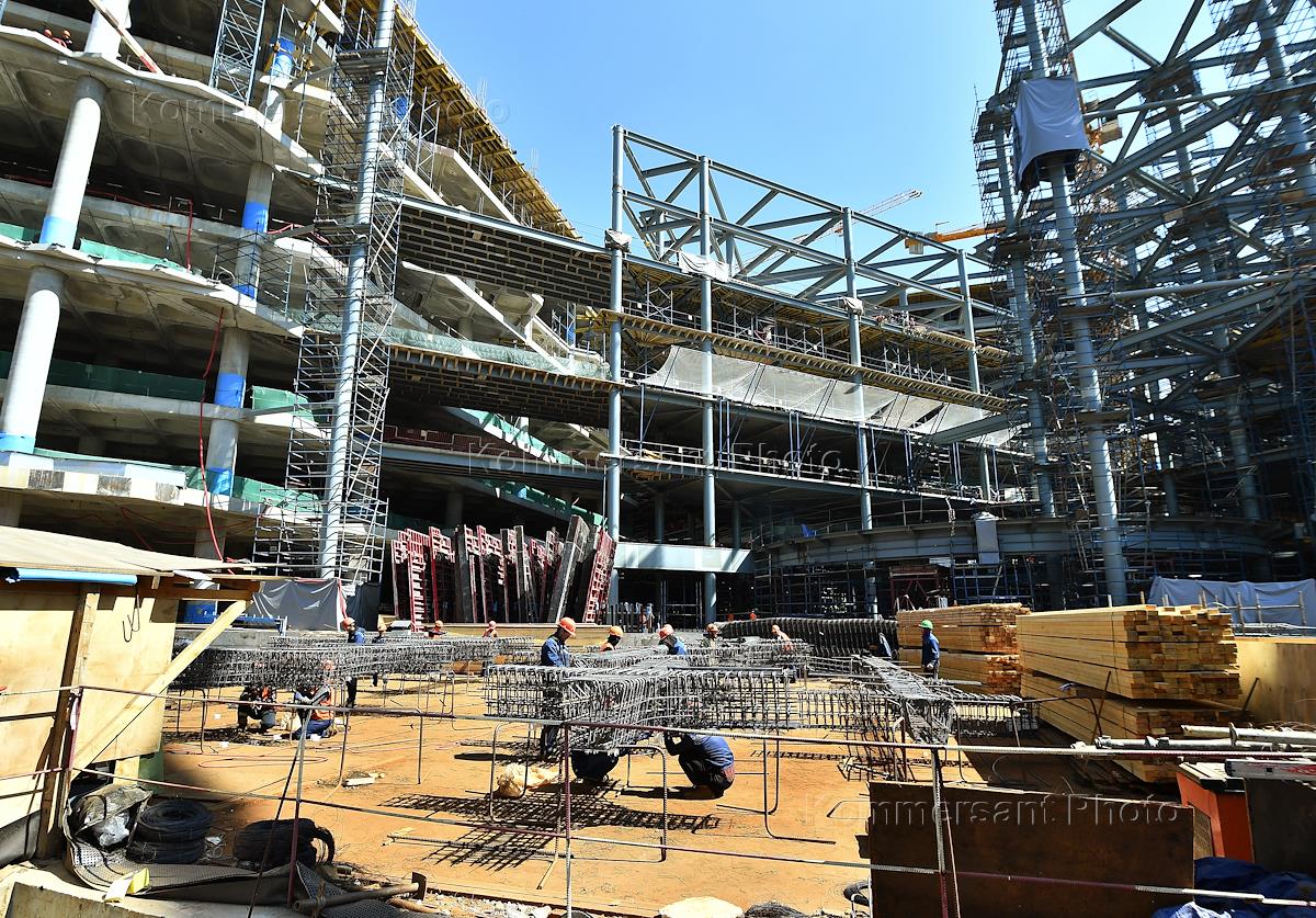 Press tour to the construction of the Yandex headquarters on Akademik Zeldovich Street. Genre photography. Workers at the construction site.