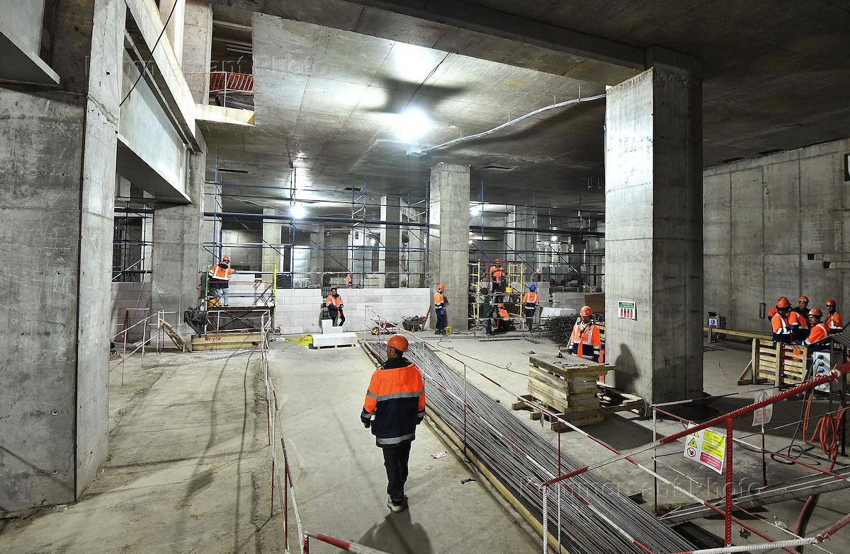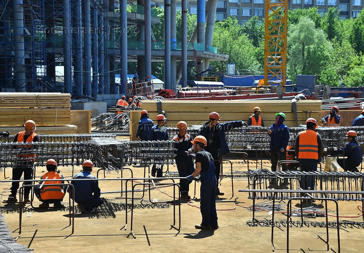 Пресс-тур на строительство штаб-квартиры компании "Яндекс" на улице Академика Зельдовича. Жанровая фотография. Рабочие на строительной площадке.