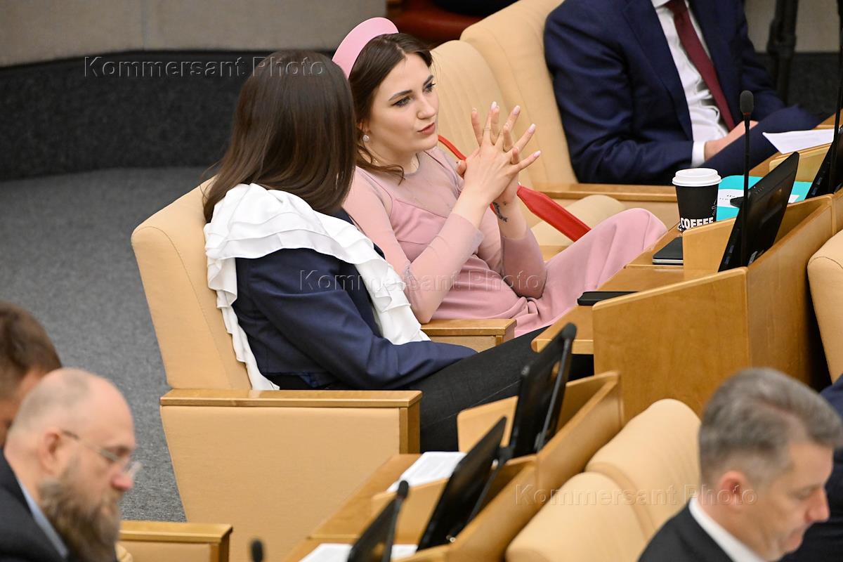 Пленарное заседание Государственной думы (ГД) России. Первый заместитель председателя комитета ГД России по науке и высшему образованию Ксения Горячева (в центре) во время заседания.