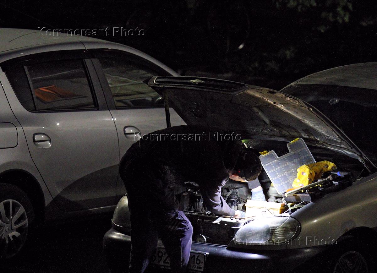 Жанровая фотография. Мужчина ремонтирует автомобиль при свете фонаря вечером на улице.