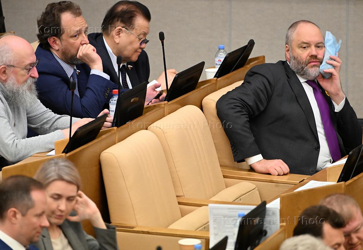 Пленарное заседание Государственной думы (ГД) России. Первый заместитель комитата по культуре ГД России Денис Майданов (в центре) во время заседания.