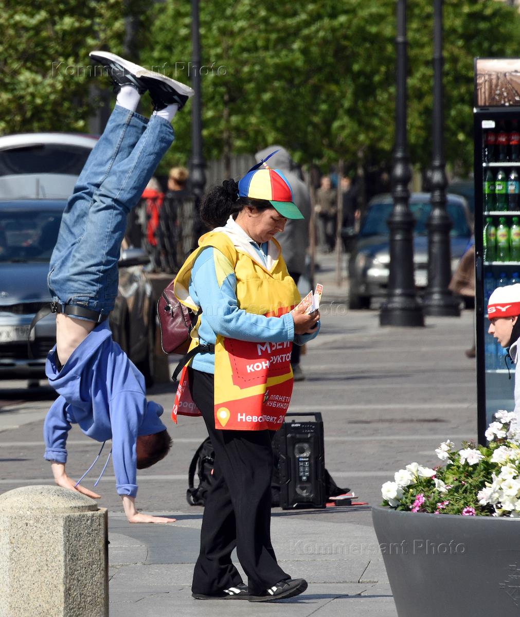 Жанровая фотография. Виды Санкт-Петербурга. Уличный танцор на Малой Конюшенной улице. Женщина, раздающая флайеры прохожим на улице.