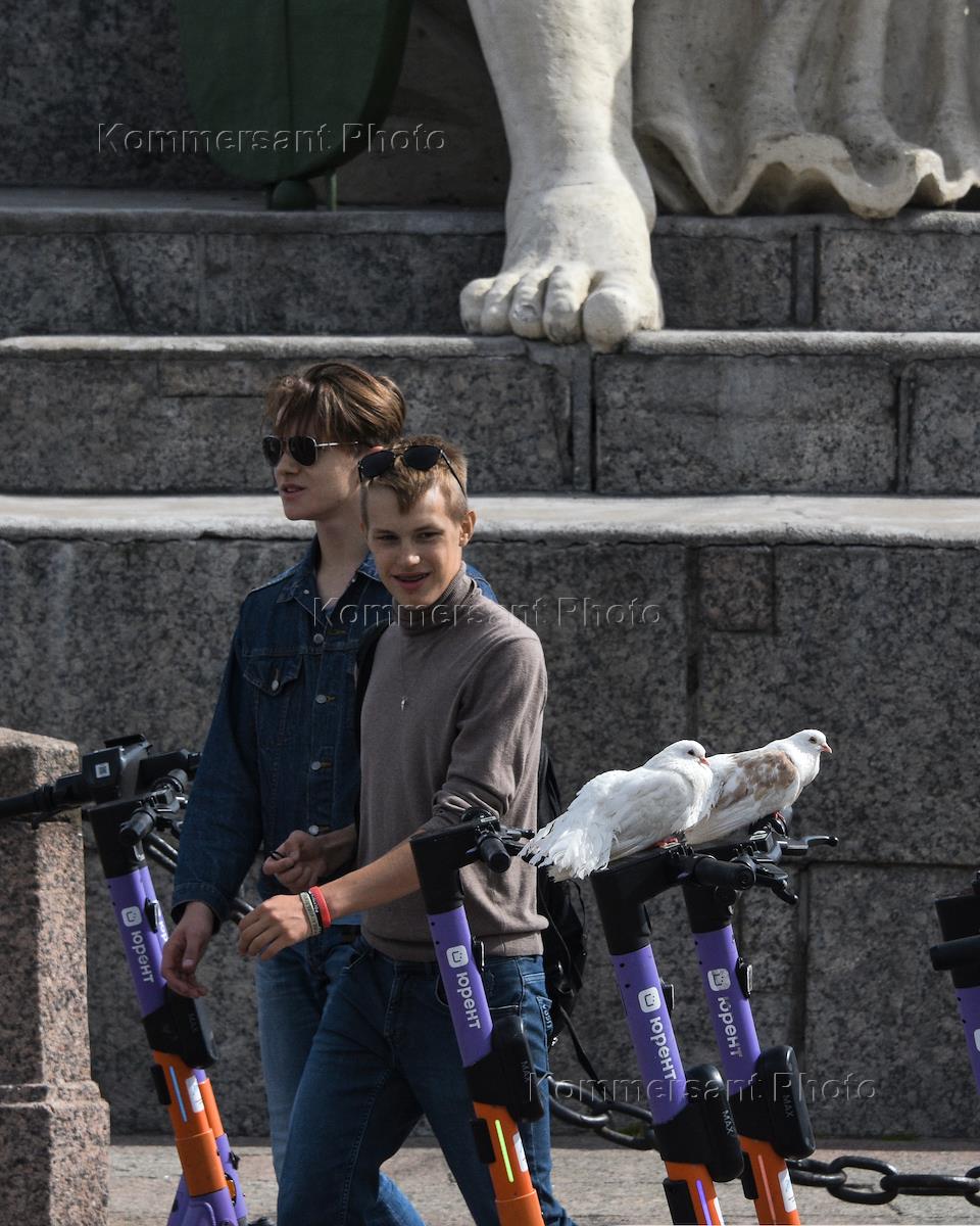 Виды Санкт-Петербурга. Жанровая фотография. Молодые люди смотрят на белых голубей, сидящих на руле самоката.