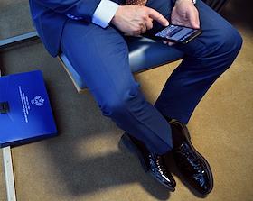 Итоговое заседание коллегии министерства России по развитию Дальнего Востока и Арктики о деятельности в 2022 году и задачах на 2023 год в МИА "Россия сегодня". Жанровая фотография. Мужчина в деловом костюме с мобильным телефоном во время заседания.