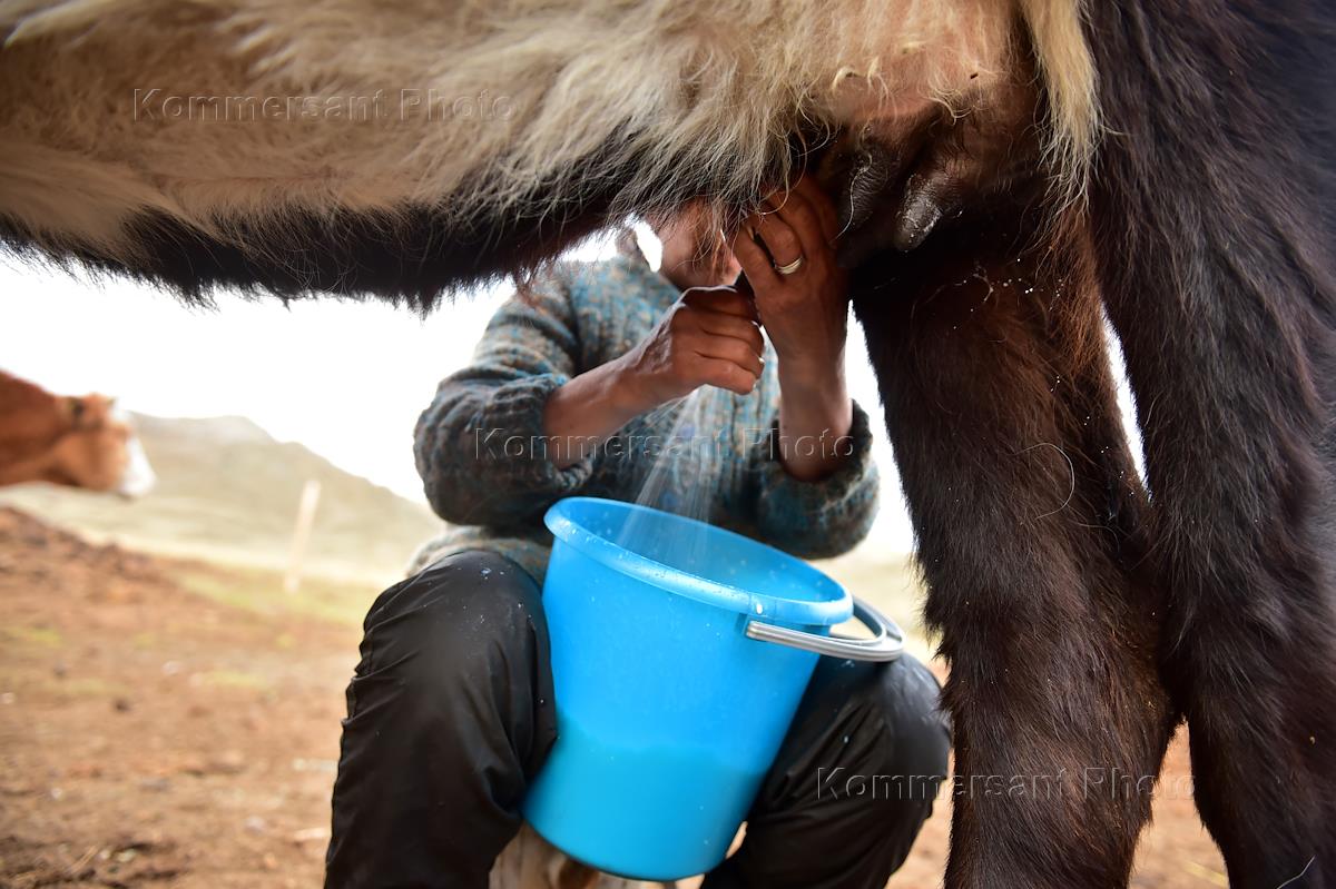 Повседневная жизнь кочевников-пастухов (чабанов) Барун-Хемчикского кожууна (района) Республики Тыва. Жанровая фотография. Хозяйка во время дойки коровы.