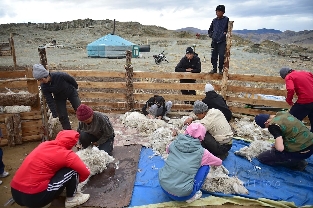 Повседневная жизнь кочевников-пастухов (чабанов) Барун-Хемчикского кожууна (района) Республики Тыва. Жанровая фотография. Чабаны во время стрижки овец.