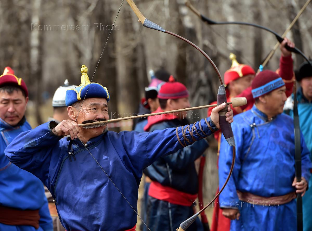 Повседневная жизнь кочевников-пастухов (чабанов) Барун-Хемчикского кожууна (района) Республики Тыва. Жанровая фотография. Соревнования по национальному тувинскому троеборью: национальная борьба "Хуреш", "Конные скачки" и национальная стрельба из лука. Участники во время соревнований.