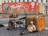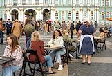 Виды Санкт-Петербурга. Жанровая фотография. Актеры массовки и участницы шахматного турнира во время съемок художественного фильма "Майор Гром" на Дворцовой площади.