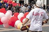 Виды Санкт-Петербурга. Жанровая фотография. Мужчина со связкой воздушных шаров и баллоном на Дворцовой площади.