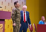 XII съезд партии "Справедливая Россия - Патриоты - За Правду" в доме отдыха "Снегири". Председатель партии "Справедливая Россия – За Правду", руководитель фракции "Справедливая Россия" в Государственной думе (ГД) России Сергей Миронов (в центре), почетный член партии "Справедливая Россия - Патриоты - За Правду" Руслан Татаринов (слева) и первый заместитель председателя комитета ГД России по просвещению Яна Лантратова (справа) во время съезда.