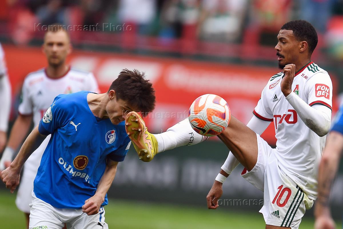 Russian Premier League (RPL). MIR - Russian Football Championship 2022/2023. 28th round. Match between the teams "Lokomotiv" (Moscow) - "Fakel" (Voronezh) at the stadium "RZD Arena". Lokomotiv team player Isidor Wilson (left) during the match.