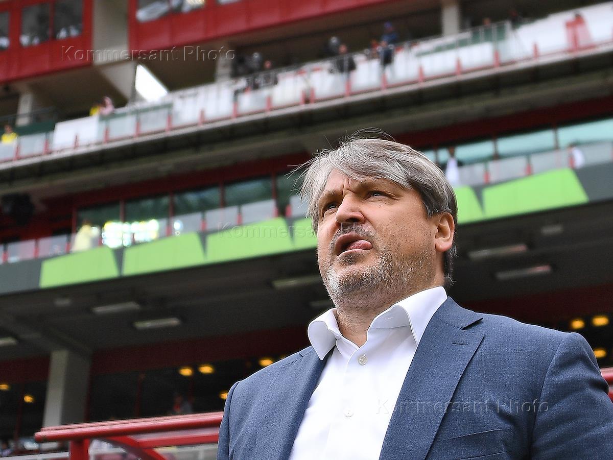 Russian Premier League (RPL). MIR - Russian Football Championship 2022/2023. 28th round. Match between the teams "Lokomotiv" (Moscow) - "Fakel" (Voronezh) at the stadium "RZD Arena". Former Fakel head coach Dmitry Pyatibratov on the podium during the match.