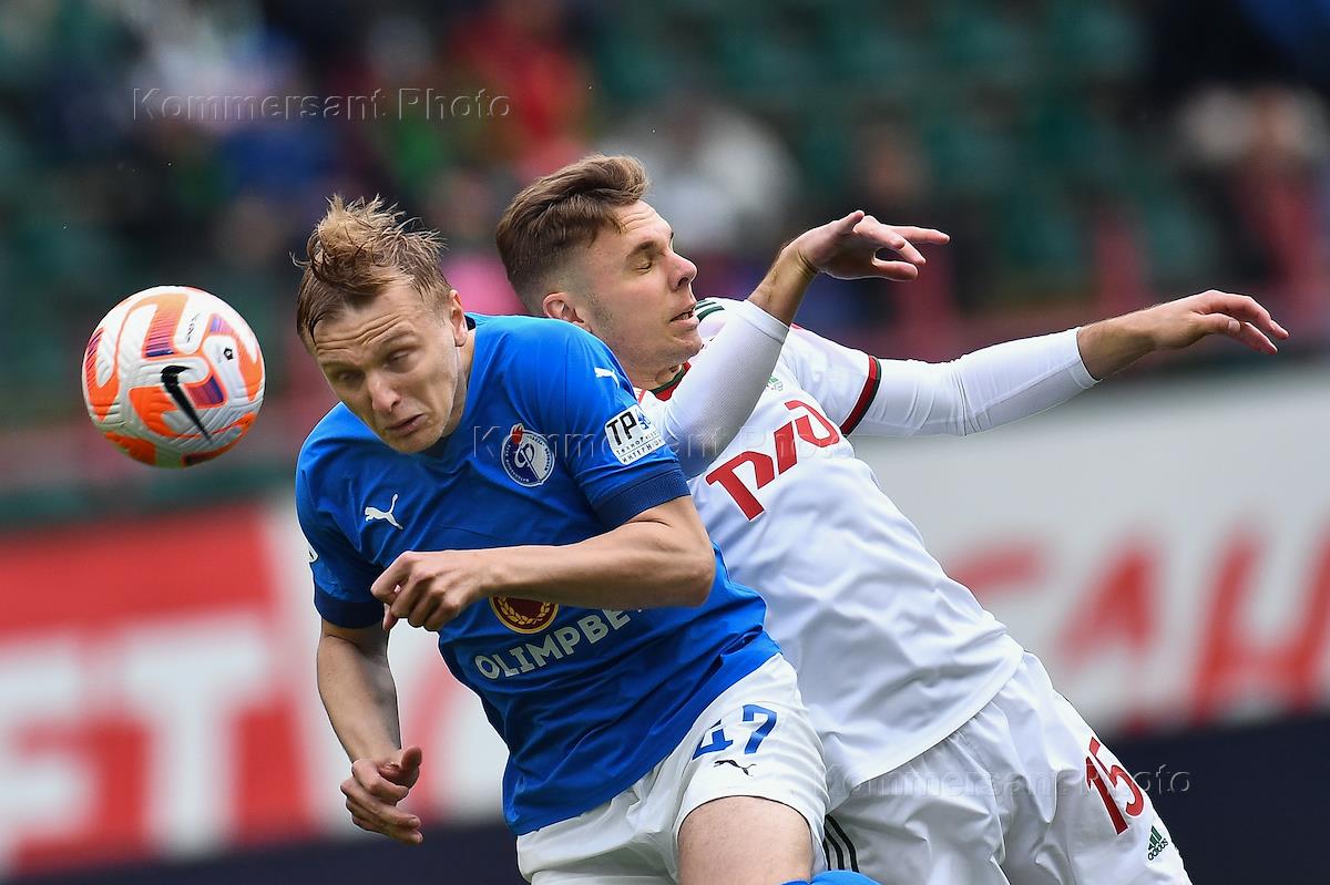 Российская Премьер-Лига (РПЛ). МИР - Чемпионат России по футболу 2022/2023. 28-й тур. Матч между командами "Локомотив" (Москва) - "Факел" (Воронеж) на стадионе "РЖД Арена". Игрок команды "Локомотив" Максим Глушенков (справа) и игрок команды "Факел" Сергей Божин во время матча.