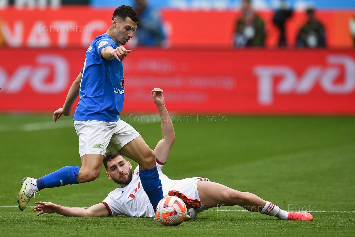 Российская Премьер-Лига (РПЛ). МИР - Чемпионат России по футболу 2022/2023. 28-й тур. Матч между командами "Локомотив" (Москва) - "Факел" (Воронеж) на стадионе "РЖД Арена". Игрок команды "Локомотив" Вильсон Изидор (слева) во время матча.