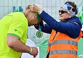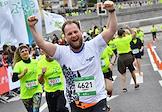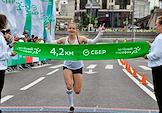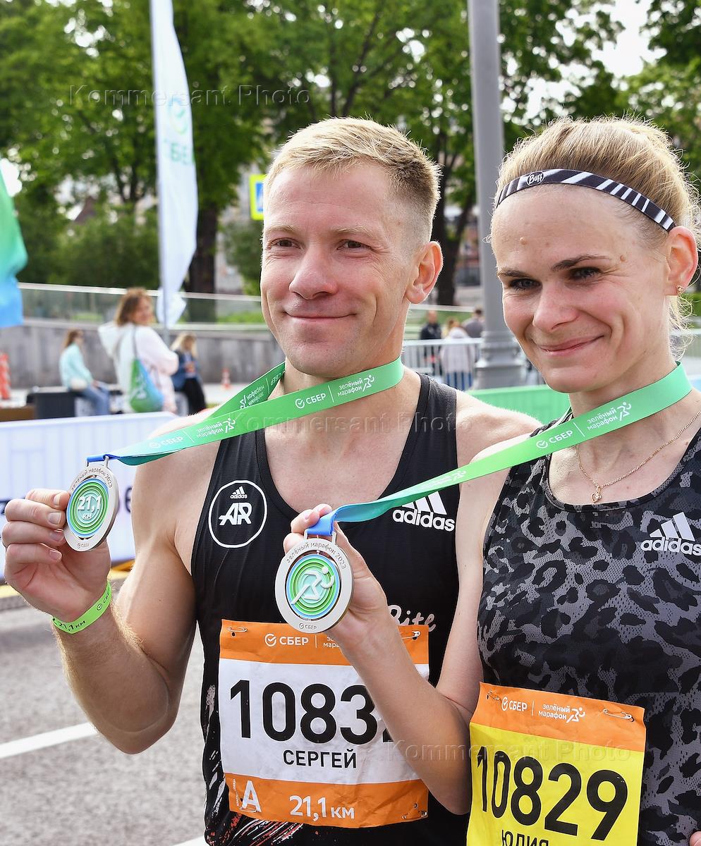 Благотворительный забег "Зеленый марафон Сбера". Участник во время церемонии награждения после забега.