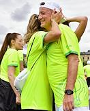 Благотворительный забег "Зеленый марафон Сбера". Участники во время церемонии награждения после забега.