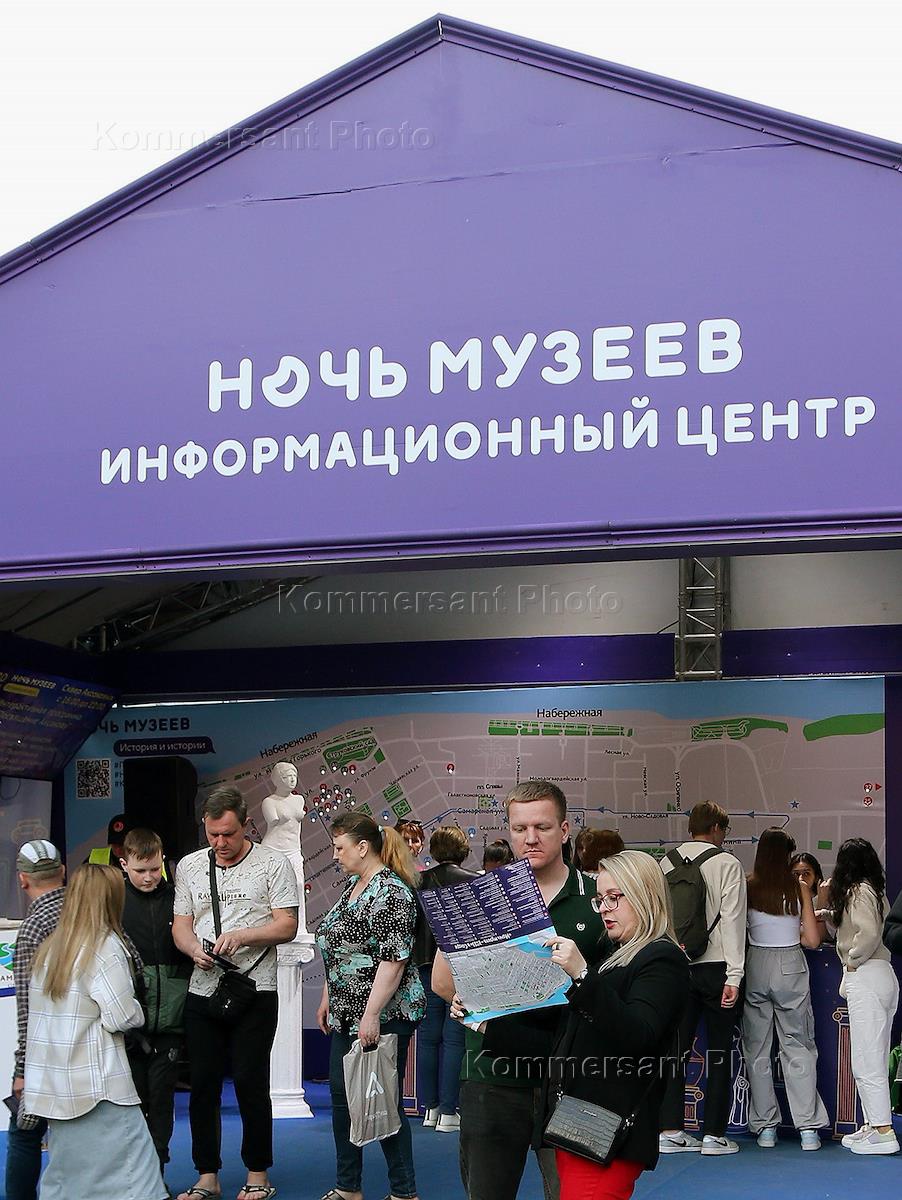 Всероссийская акция "Ночь музеев 2023" в Самаре. Тема акции в этом году: "История и истории". Жанровая фотография. Участники акции в информационном центре на перекрестке улиц Куйбышева и Ленинградской.