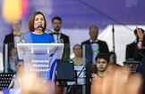Национальное собрание "Европейская Молдова" за включение в Конституцию поправок о необратимости вступления в Евросоюз на площади в Кишиневе. Президент Молдавии Майя Санду во время акции.