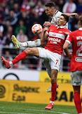 Российская Премьер-Лига (РПЛ). МИР - Чемпионат России по футболу 2022/2023. 28-й тур. Матч между командами "Спартак" (Москва) - ЦСКА (Москва) на стадионе "Открытие банк Арена". Игроки команды "Спартак" Квинси Промес (слева) и Бальде Кейта (справа) во время матча.