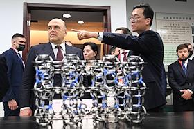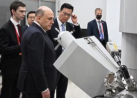 Рабочая поездка председателя правительства России Михаила Мишустина в Китай. Председатель правительства России Михаил Мишустин (слева) во время посещения Шанхайского научно-исследовательского института нефтехимии Китайского национальной нефтехимической корпорации Sinopec.