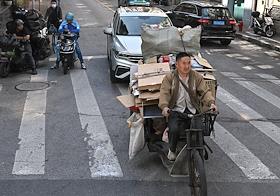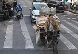 Рабочая поездка председателя правительства России Михаила Мишустина в Китай. Жанровая фотография. Мужчина на прицепе мотоцикла мусор по улице города.