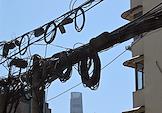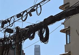 Рабочая поездка председателя правительства России Михаила Мишустина в Китай. Жанровая фотография. Провода коммуникаций на столбе на улице города.