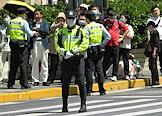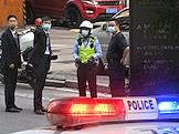 Рабочая поездка председателя правительства России Михаила Мишустина в Китай. Жанровая фотография. Виды Шанхая. Полицейские и пешеходы в масках на лице на улице города.