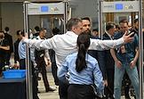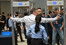 Рабочая поездка председателя правительства России Михаила Мишустина в Китай. Российско-Китайский бизнес-форум в конгресс-центре The Grand Walls. Жанрвоая фотография. Проход участников форума через рамки металлоискателя.