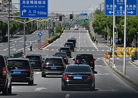 Рабочая поездка председателя правительства России Михаила Мишустина в Китай. Жанровая фотография. Виды Шанхая. Кортеж автомобилей с дипломатическими номерами на трассе в городе.