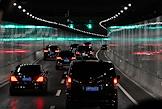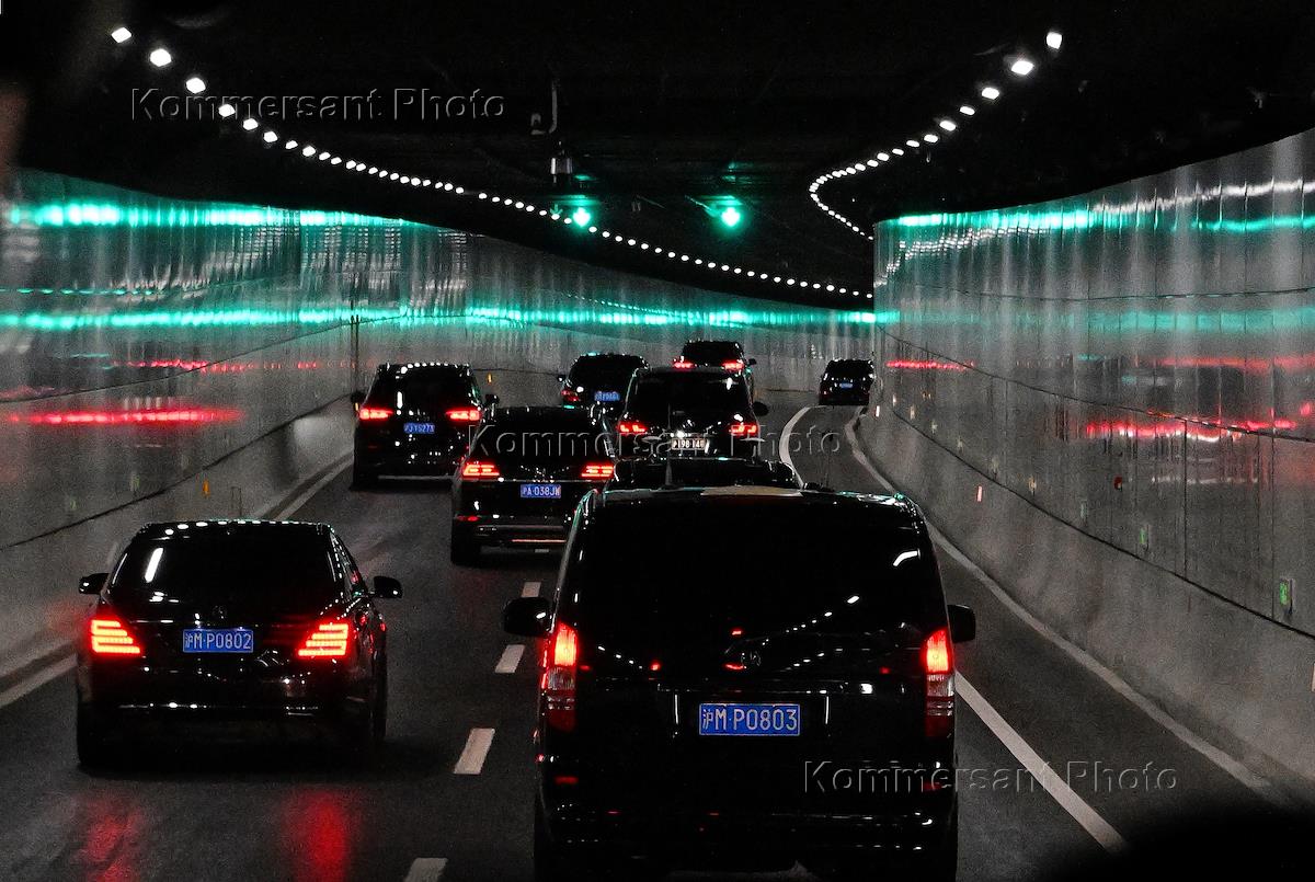 Рабочая поездка председателя правительства России Михаила Мишустина в Китай. Жанровая фотография. Виды Шанхая. Автомобили с дипломатическими номерами в тоннеле автомобильной трассы.