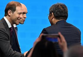 Рабочая поездка председателя правительства России Михаила Мишустина в Китай. Российско-Китайский бизнес-форум в конгресс-центре The Grand Walls. Заместитель председателя правительства России - министр промышленности и торговли России Денис Мантуров (слева) перед началом форума.