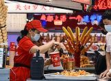 Рабочая поездка председателя правительства России Михаила Мишустина в Китай. Жанровая фотография. Виды Шанхая. Уличная еда. Девушка продавец в маске на лице отпускает фаст фуд клиентам.