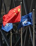 Рабочая поездка председателя правительства России Михаила Мишустина в Китай. Российско-Китайский бизнес-форум в конгресс-центре The Grand Walls. Флаги КНР и форума перед зданием конгресс-центре.