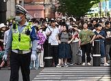 Рабочая поездка председателя правительства России Михаила Мишустина в Китай. Жанровая фотография. Сотрудник полиции Китая во время дежурства на улице города.