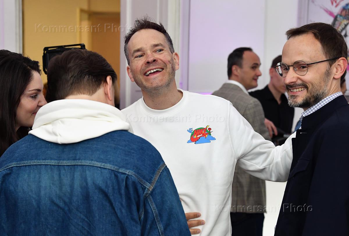 Церемония открытия выставки Vis-a-vis ("Лицом к лицу"), посвященная 8-летию благотворительного фонда "Друзья" в Московском музее современного искусства. Генеральный директор инвестиционного фонда "Группа Онэксим" Дмитрий Разумов (в центре) на церемонии.