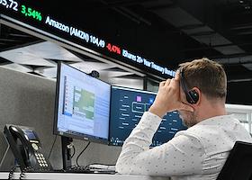Работа финансовой компании ПАО "СПБ Биржа" в башне "Меркурий". Жанровая фотография. Сотрудник во время работы в офисе компании.