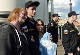 Мероприятия, посвященные отправке военнослужащих к месту прохождения военной службы по призыву в Вооруженных силах России, перед собором Святой Живоначальной Троицы лейб-гвардии Измайловского полка. Родственники во время прощания перед отправкой.