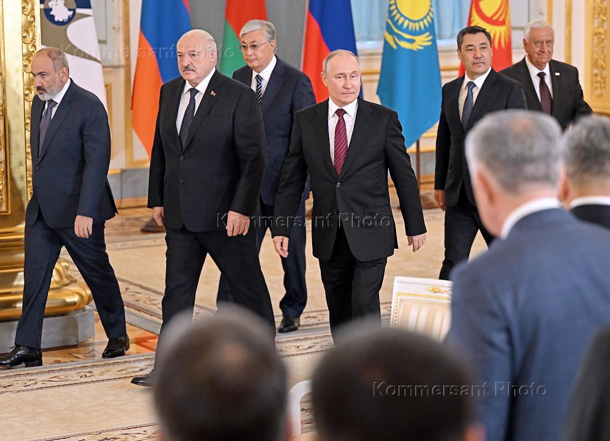 Meeting of the Supreme Eurasian Economic Council (SEEC) in the Grand Kremlin Palace. From left to right: Armenian Prime Minister Nikol Pashinyan, Belarusian President Alexander Lukashenko, Russian President Vladimir Putin, Kazakh President Kassym-Zhomart Tokayev and Kyrgyz President Sadyr Japarov during a joint photographing ceremony before the meeting.