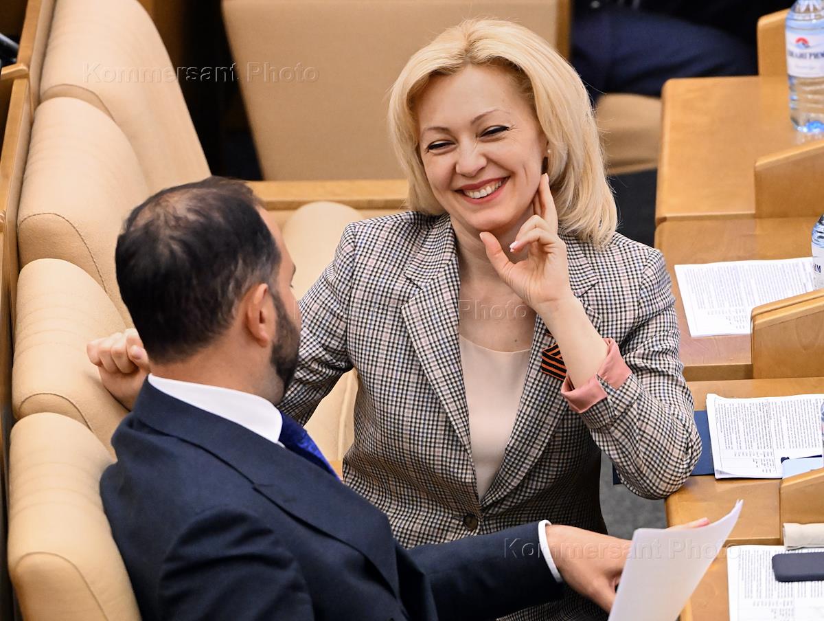 Пленарное заседание Государственной думы (ГД) России. Заместитель председателя ГД России Ирина Яровая (слева) и первый заместитель председателя комитета ГД по труду, социальной политике и делам ветеранов Николай Коломейцев (справа) во время заседания.