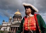 Церемония возложения цветов к памятнику императору Петру I в честь 320-летия со дня образования Санкт-Петербурга. Жанровая фотография. Актер в костюме Петра Первого на Исаакиевской площади.